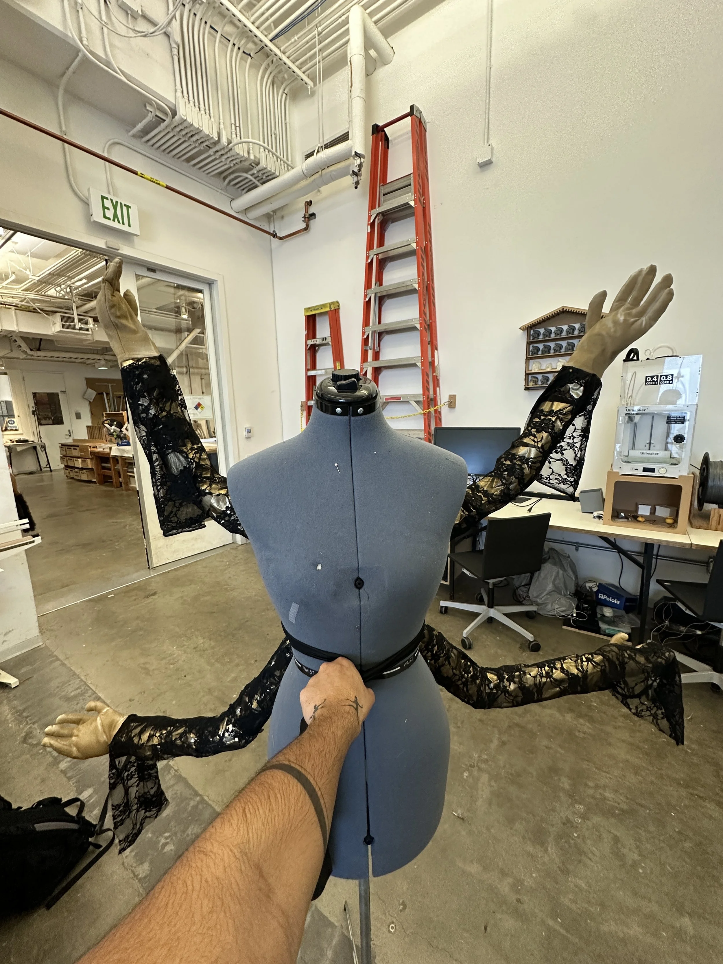 This look was inspired by a story of Hanuman - in summary he is asked by Rama and Sita (akin to divine masculine & feminine) to prove his devotion to them. To do so, he tears open his heart to reveal Rama and Sita inside. I sought to subvert this into two divinely feminine figures, and Axel my lovely model did a reveal during their walk. (see livestream)